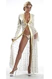 Custom Made Slinky Winter Wonderland Victorian Satin Trimmed White Gold Mesh Coat Gown with long sleeves and flouncy cuffs. [Shown with Micro Thong Panty 4021SQ sold separately.]